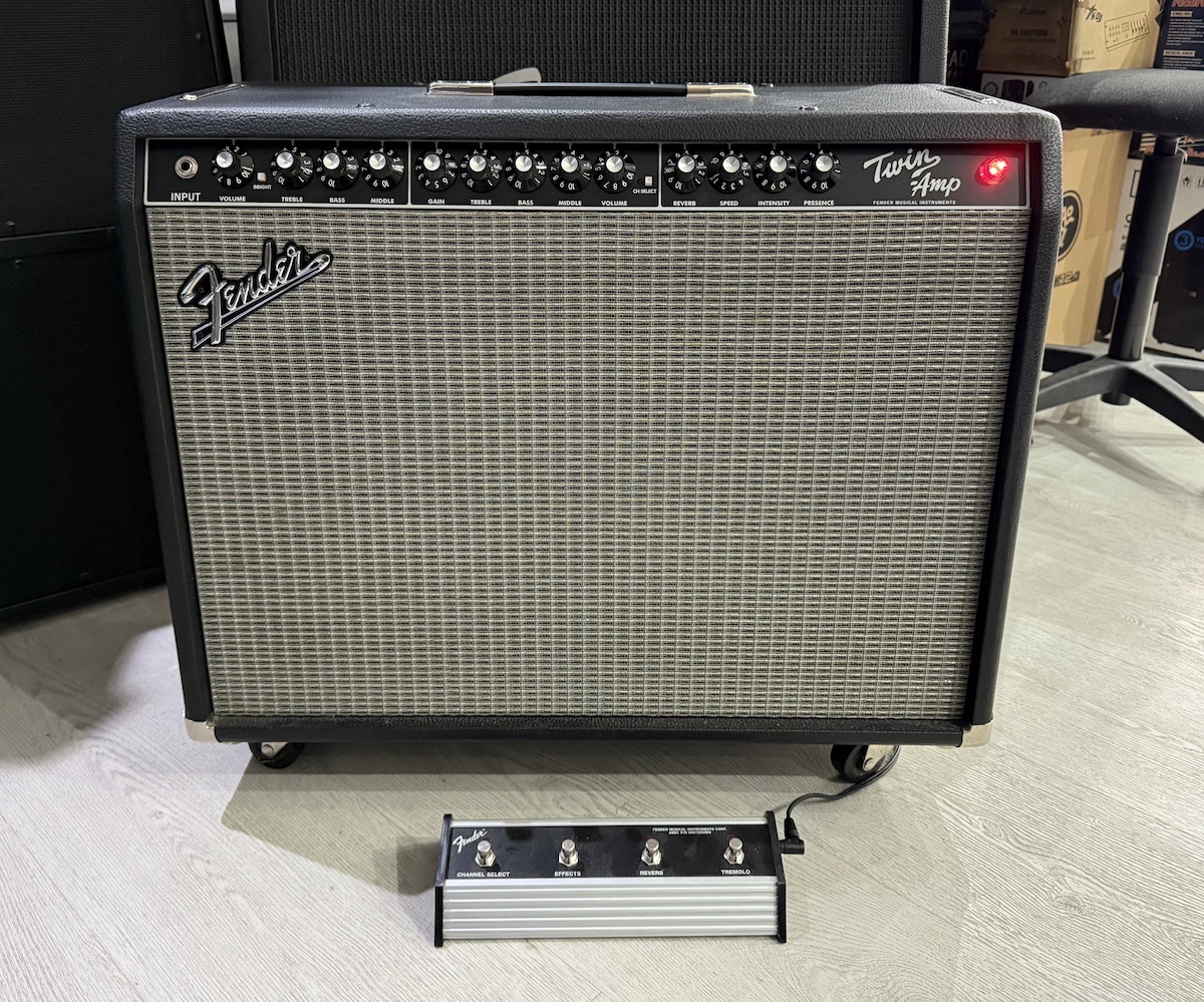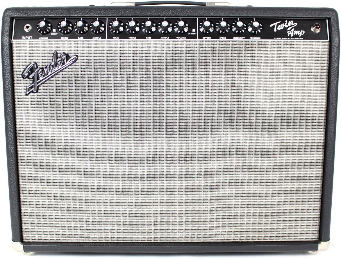Fender Twin Amp è un amplificatore valvolare da 100W con possibilità di utilizzo a 25W, dotato di 2 woofer da 12”