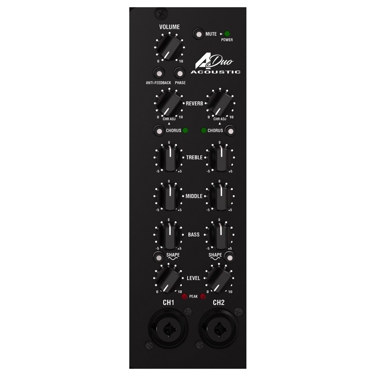 60W – 2 canali con eq. a 3 bande, riverbero, chorus e pre-shape indipendenti – phantom power per microfoni a condensatore – 2 ingressi combo jack/XLR – Uscita D.I. XLR pre/post con ground lift – ingresso Aux per lettore mp3 – Uscita cuffie – Anti-feedback – loop effetti – DSP con 4 preset di voicing globale – Speaker custom designed da 8″ con tweeter coassiale da 1”