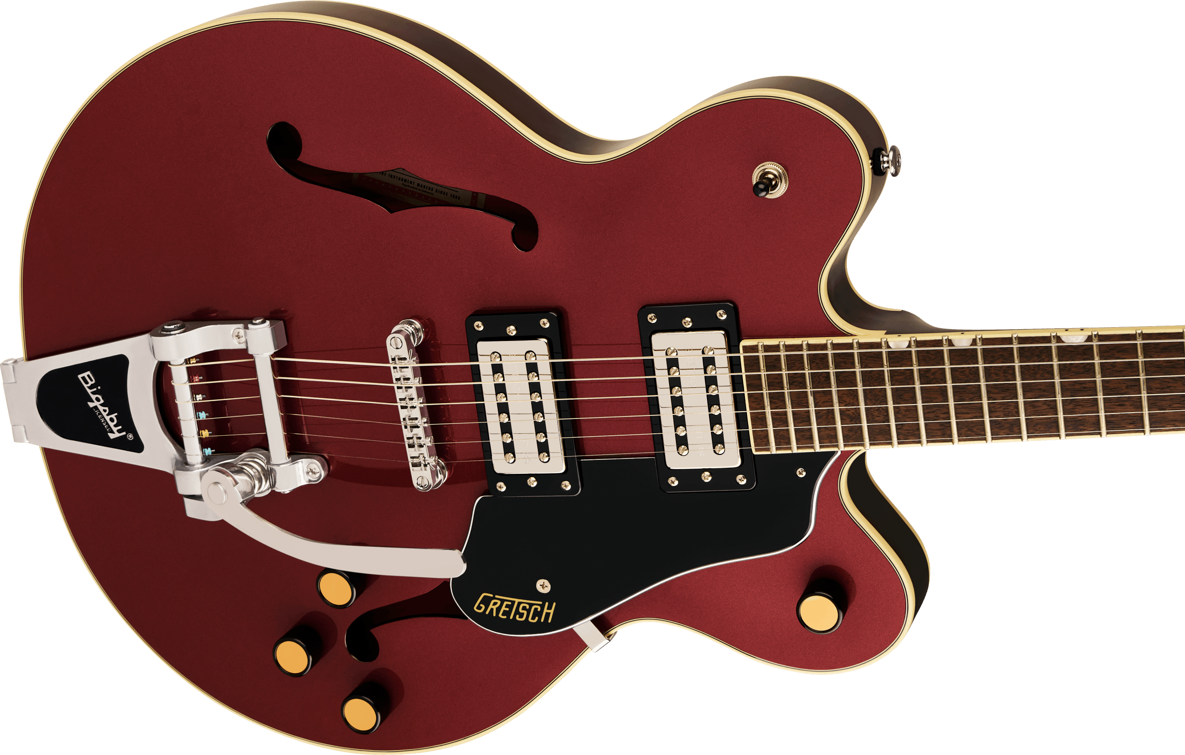 Riportando in vita i migliori elementi del passato, la G2622T Streamliner Center Block Double-Cut con V-Stoptail irrompe nell’era della musica moderna con un suono ed uno stile potenti. Sfacciata e resistente al feedback, l’elegante G2622T è progettata per il chitarrista che richiede più del banale da una performance strumentale, più stile, e soprattutto più volume, pur mantenendo tutto ciò che ci si aspetta da una Gretsch. Il segreto del suono della Streamliner è duplice: i pickup humbucking Broad’Tron BT-2S ed il blocco centrale in abete. Progettati appositamente per la collezione Streamliner, i pickup Broad’Tron ad alto rendimento generano una definizione migliorata con una risposta dei bassi più tesa e robusta, alti incontaminati ed una gamma media gutturale. Un blocco centrale in abete corre per tutta la lunghezza del body, rinforzando la parte superiore ed eliminando al contempo il feedback indesiderato. La potenza sonora della Streamliner è sfruttata e modellata dai tradizionali controlli del volume del pickup al manico e al ponte, un controllo del tono principale, un controllo del volume principale e un selettore del pickup a tre vie. Una tastiera in Alloro con raggio di 12″ con eleganti intarsi Big Block madreperlati e 22 tasti jumbo medi si trova sopra il manico con binding bianco con un profilo sottile a “U”, ideale per accordi o riff infuocati. Goditi un’accordatura stabile come una roccia grazie all’elegante cordiera Bigsby B70, al ponte Adjusto-Matic ed al capotasto in osso sintetico. Tutto l’accattivante stile classico che ti aspetti da una Gretsch è qui con manopole nere in stile vintage.