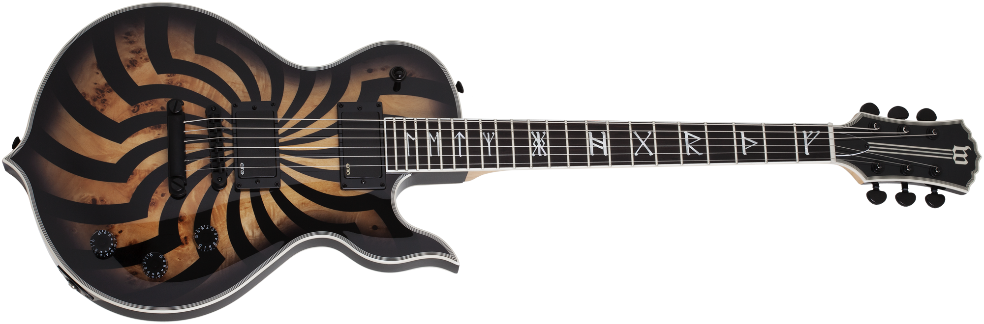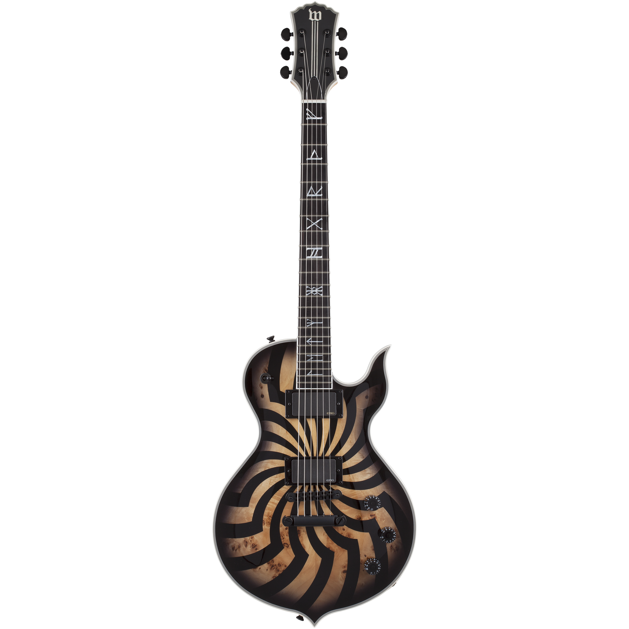 ODIN GRAIL BUZZSAW – Chitarra Elettrica 6 corde – Struttura: Set-neck – Corpo: Mogano – Top: Burl Arched Buzzsaw – Manico: Acero 3 pezzi – Profilo Manico: Zakk C – Tastiera: Ebano – Scala: 24,625” – Radius: 14” – 22 tasti X-Jumbo – Binding: Bianco Multistrato – Intarsi: Rune – Capotasto: Graph Tech XL Ivory Tusq 43mm – Pickup: 1x EMG 81 + 1x EMG 85 – Controlli: 1x Tono + 2x Volume + Selettore a 3 posizioni – Ponte: TonePros T3BP TOM con T1ZS Tailpiece – Meccaniche: Grover Rotomatic 18:1 – Finitura hardware: Nero Satinato – Grafica: Buzzsaw – Colore: Charcoal Burst – Finitura: Lucida.