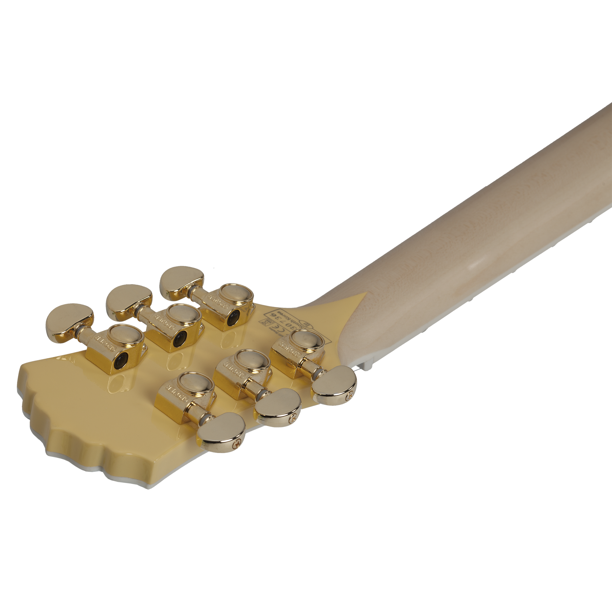 ODIN GRAIL – Chitarra Elettrica 6 corde – Struttura: Set-neck – Corpo: Mogano – Top: Acero Arched Bullseye – Manico: Acero 3 pezzi – Profilo Manico: Zakk C – Tastiera: Ebano – Scala: 24,625” – Radius: 14” – 22 tasti X-Jumbo – Binding: Bianco Multistrato – Intarsi: Blocks Madreperla – Capotasto: Graph Tech XL Ivory Tusq 43mm – Pickup: 1x EMG 81 + 1x EMG 85 – Controlli: 1x Tono + 2x Volume + Selettore a 3 posizioni – Ponte: Tonepros LPM04 Set – Meccaniche: Grover Rotomatic 18:1 – Finitura hardware: Dorato – Grafica: Bullseye – Colore: Genesis – Finitura: Lucida.